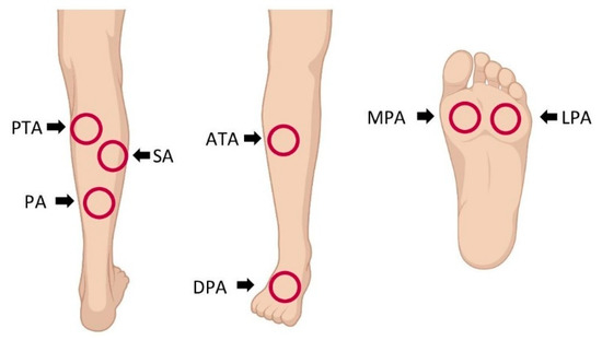 Locations for hyperspectral imaging (HSI) assessment in patients with peripheral artery disease: HSI was performed in the angiosomes of the posterior tibial artery (PTA), sural artery (SA), peroneal artery (PA), anterior tibial artery (ATA), dorsal pedal artery (DPA), medial plantar artery (MPA) and lateral plantar artery (LPA).