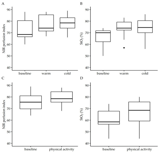 Neither extreme temperatures, induced by cold or hot foot bath, nor physical activity, induced by 50 repetitions of a rocking-to-the-toe stand, had a significant effect on the NIR perfusion index or StO2 (Figure 2). Median baseline values of the NIR perfusion index and StO2 of 68.5 (66.5, 80.5) and 70% (62.3%, 71.75%) were only slightly affected by both the warm foot bath (74 (71.5, 85.5), p = 0.606 and 74% (72.3%, 79.3%), p = 0.146) and cold foot bath (78.5 (74, 83), p = 0.177 and 74.5% (70%, 80.5%), p = 0.124), respectively. In parallel, median baseline values of the NIR perfusion index and StO2 of 75.5 (69.8, 81) and 58.5 (56.5, 67.8) were not affected by physical activity (78.5 (75.5, 84.5), p = 0.358 and 68.5% (59.3%, 75.8%), p = 0.202), respectively.