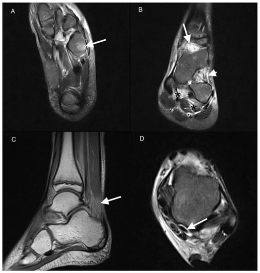Tenosynovitis was seen less frequently than synovitis and BME in the current study—in 27%, all with JIA. However, it was the only feature which was significantly more common in the JIA vs. non-JIA group (p = 0.031). Long flexors and long extensors of the toes, flexor hallucis longus, and peroneus complex sheaths were affected, with two cases of secondary tendon involvement of the tibialis posterior tendon and flexor hallucis longus tendon. Tenosynovitis was detected by Javadi et al. [] in 39% of patients, also less frequently than synovitis, and the tibialis posterior tendon (39%) and peroneus complex (18%) were the most commonly involved.