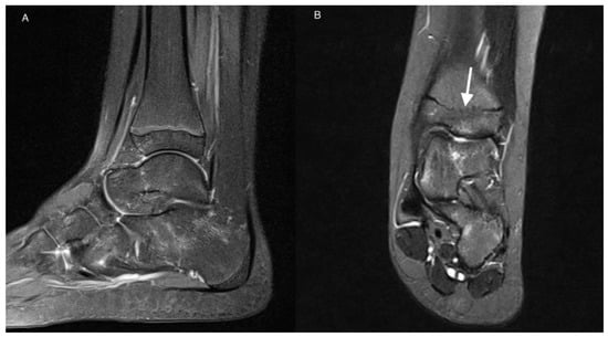 MRI of the left ankle of an 11-year-old girl with JIA. T2-weighted TIRM images in sagittal (A) and coronal (B) planes. Patchy BME (stage 1) in talus and calcaneus. Developmental disorder in the form of premature closure of physis (arrow).