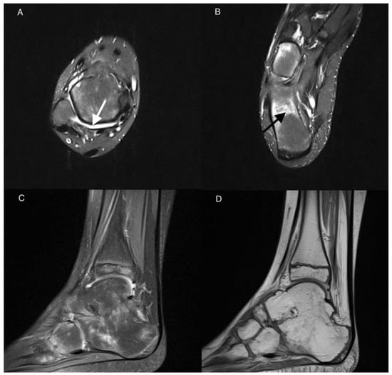 MRI of the right ankle of a 9-year-old boy with JIA. Axial T2-weighted TIRM images (A,B), sagittal PD with fat saturation (C), and sagittal PD-weighted image (D). Effusion/synovial thickening stage 2 in the tibio-talar joint (arrow). BME in numerous bones of the ankle and tarsum, the most advanced in calcaneus stage 3 (arrow in (B)). Tibio-talar joint space narrowing, tibio-calcaneal ankylosis, and osteophytes (C,D).