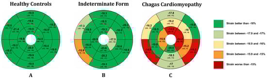 - Romano MM, D.; Moreira, H.T.; Marin-Neto, J.A.; Baccelli, P.E.; Alenezi, F.; Klem, I.; Maciel, B.C.; Kisslo, J.; Schmidt, A.; Velazquez, E.J. Early impairment of myocardial deformation assessed by regional speckle-tracking echocardiography in the indeterminate form of Chagas disease without fibrosis detected by cardiac magnetic resonance. PLoS Negl. Trop. Dis. 2020, 14, e0008795. [Google Scholar] [CrossRef] [PubMed]