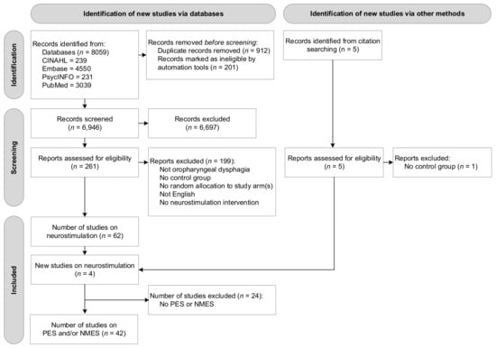 A total of 8059 studies were identified through subject heading and free text searches from the four databases: CINAHL (n = 239), Embase (n = 4550), PsycINFO (n = 231), and PubMed (n = 3039). Removing duplicate titles and abstracts (n = 1113) left a total of 6946 records. A total of 261 original articles were assessed at a full-text level, with articles grouped based on type of intervention. Four additional studies were found through reference checking of the included articles. At this stage, no studies were excluded based on type of intervention (e.g., behavioural intervention, neurostimulation). Of the reviewed 261 articles, 58 studies on neurostimulation were identified that satisfied the inclusion criteria. As this systematic review reports on PES and NMES interventions only, a final number of 42 studies reporting on peripheral neurostimulation were included in this review. Figure 1 presents the flow diagram of the reviewing process according to PRISMA.