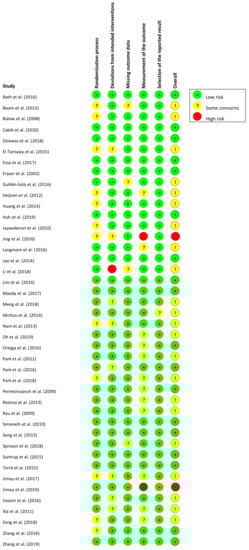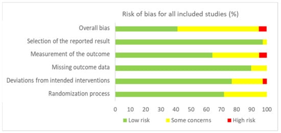 - Sterne, J.A.; Savović, J.; Page, M.J.; Elbers, R.G.; Blencowe, N.S.; Boutron, I.; Cates, C.J.; Cheng, H.Y.; Corbett, M.S.; Eldridge, S.M.; et al. RoB 2: A revised tool for assessing risk of bias in randomised trials. BMJ 2019, 366, l4898. [Google Scholar] [CrossRef] [Green Version]