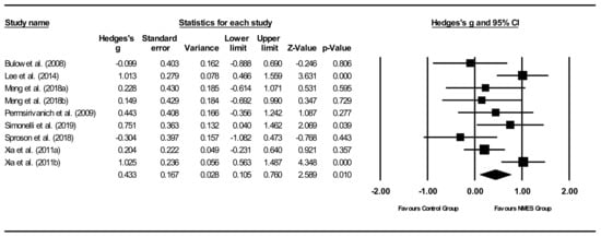 Overall between-group analysis (Figure 5). A significant, small post-intervention between-group total effect size in favour of NMES was calculated using a random-effects model (z(8) = 2.589, p = 0.010, Hedges’ g = 0.433, and 95% CI = 0.105–0.760). Between-study heterogeneity was significant (Q(8) = 18.0, and p = 0.021), with I2 showing that heterogeneity accounted for 55.6% of variation in effect sizes across studies.
