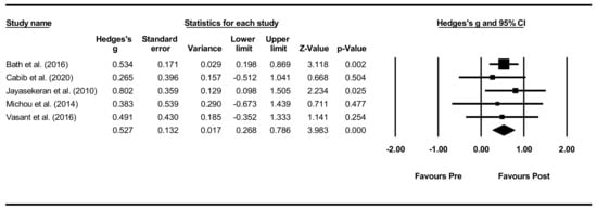 Overall within-group analysis. The pre-post intervention effect sizes for the included studies ranged from 0.265 (small effect) [66] to 0.802 (large effect) [62], with an overall moderate effect size of 0.527 (Figure 6). As one study, however, did not provide PAS data for all included participants [65], a sensitivity analysis was conducted for both PAS and DSRS, indicating minimal differences in effect sizes.