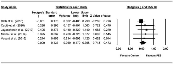 Overall between-group analysis. A non-significant post-intervention between-group total effect size in favour of PES was found using a random-effects model (z(4) = 0.718, p = 0.473, Hedges’ g = 0.099, and 95% CI = −0.170–0.368), suggesting no improvement in PAS outcomes following PES neurostimulation (Figure 7). Between-study heterogeneity was non-significant (Q(4) = 1.8, and p = 0.766).