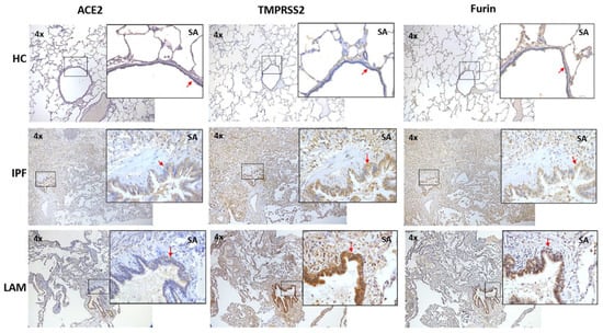 ACE2, TMPRSS2, and Furin expression on small airway epithelium and alveolar areas of IPF and LAM patients compared to HC. Representative images (4×) and inset images (40×) were taken using a bright field microscope. Each image from each group was taken from the same subject and the same area within the tissue. SA—small airways. Red arrows indicate the small airway epithelium.