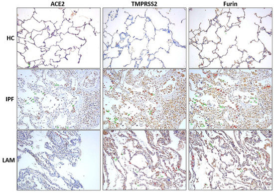 ACE2 is the first step for the virus to attach to the host cell membrane [24,33]. Cofactor facilitating SARS-CoV-2 infectivity such as TMPRSS2 cleaves the spike (S) protein of SARS-CoV-2 and facilitates the fusion of SARS-CoV-2 and cellular membranes [24,25], thus a critical factor enabling cellular infection [34]. Furin is another potential protease to facilitate viral infections. It is highly expressed in the lung and implicated in viral infections on the respiratory tract by activating the surface glycoprotein, cleaving viral envelope glycoproteins, thereby enhancing viral fusion with host cell membranes [26]. In the current study, we observed increased positive expression of TMPRSS2 and Furin in the small airway epithelium and alveolar areas, which are majorly localized in cytoplasm and nuclei in both IPF and LAM sections, compared to HC (Figure 1).