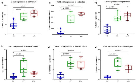 Quantitative analysis of (i) ACE2, (ii) TMPRSS2, and (iii) Furin expression in the small airway epithelium of IPF and LAM patients compared to HC. Quantitative analysis of (iv) ACE2, (v) TMPRSS2, and (vi) Furin expression in alveolar areas of IPF and LAM patients compared to HC. Significance is considered p < 0.05.