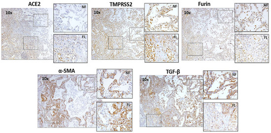 ACE2, TMPRSS2, Furin, myofibroblasts marker α-SMA, and growth factor TGF-β1 expression in fibrotic lesions and non-fibrotic lesions in IPF patients. Representative images (10×) and inset images (40×) were taken using a bright field microscope. Each marker image was taken from the same subject in the same tissue area. NF—non fibrotic lesion; FL—fibrotic lesion.