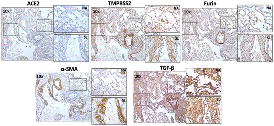 ACE2, TMPRSS2, Furin, myofibroblasts marker α-SMA, and growth factor TGF-β1 expression in “smooth muscle like” lesion and normal alveolar area in LAM patients. Representative images (10×) and inset images (40×) were taken using a bright field microscope. Each marker image was taken from the same subject in the same tissue area. NA—normal alveolar area; SL—“smooth muscle like” lesion.