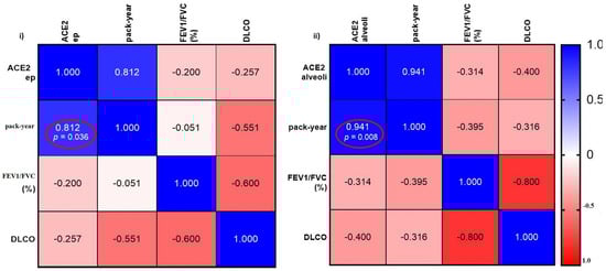 (i) Correlation between smoking history and ACE2 expression on SA epithelium (ep). (ii) Correlation between smoking history and ACE2 expression in alveolar areas in IPF patients. Significance is considered p < 0.05.