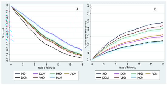 Adjusted survival curves (A) and adjusted incidence curves for cardiovascular death (B) based on heart failure etiology. ACM, alcoholic cardiomyopathy; DCM, dilated cardiomyopathy; DICM, drug-induced cardiomyopathy; HCM, hypertrophic cardiomyopathy HHD, hypertensive heart disease; IHD: ischemic heart disease; VHD, valvular heart disease.