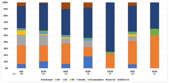 Causes of death according to the etiology of heart failure. ACM, alcoholic cardiomyopathy; CV, cardiovascular; DCM, dilated cardiomyopathy; DICM, drug-induced cardiomyopathy; HCM, hypertrophic cardiomyopathy; HF, heart failure; HHD, hypertensive heart disease; IHD: ischemic heart disease; MI, myocardial infarction; SD, sudden death; VHD, valvular heart disease.