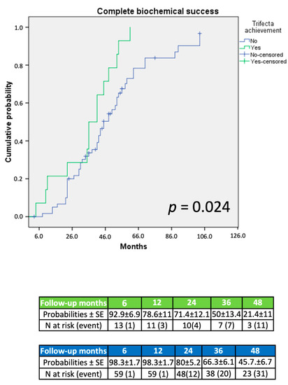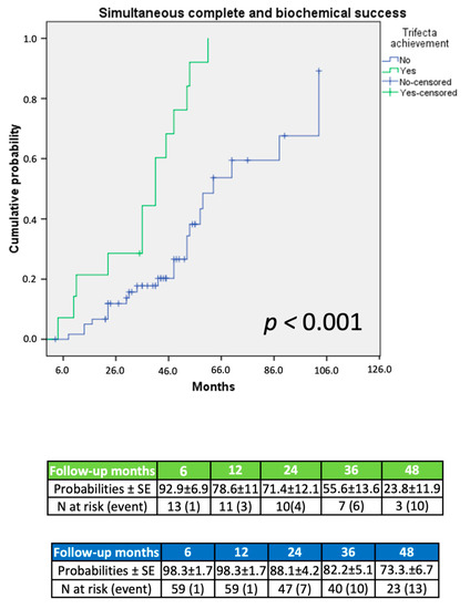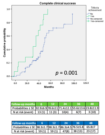 At Kaplan–Meier analysis, patients achieving trifecta displayed significantly higher complete clinical (p = 0.001; Figure 1), biochemical (p = 0.02; Figure 2), and simultaneous success (p < 0.001; Figure 3) rates at an extended follow-up, respectively.