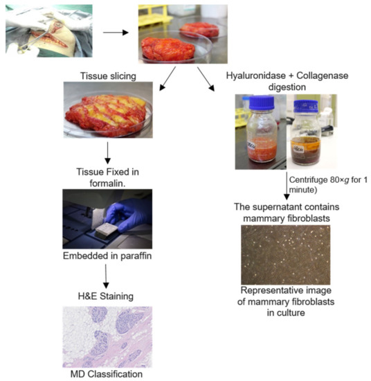 Protocol for breast tissue processing. Human breast tissues were collected from surgery patients. One portion of this tissue was enzymatically digested for 16 h. Mammary fibroblasts were obtained through several steps of washing the stromal cell component. Another portion of breast tissue was formalin fixed paraffin embedded and stained with haematoxylin and eosin for histological scoring of density.