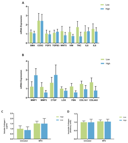 When fibroblast samples were separated according to whether they came from a patient with high (n = 7) or low (n = 9) MD no differences in mRNA expression of CAF-related genes were observed between fibroblasts from high and low MD tissues when treated with MPO (Figure 5A). MPO did not have differential effects on mRNA expression of ECM regulatory genes from high MD fibroblasts compared to low MD fibroblasts (Figure 5B). No differences in soluble collagen I or insoluble collagen production were observed between fibroblasts from high and low MD tissues when treated with MPO (Figure 5C,D).