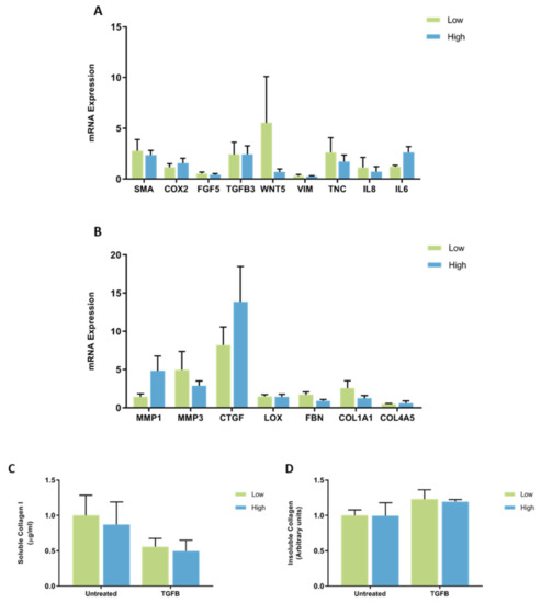 When accounting for the patient’s MD score, there were no significant differences in the expression of CAF genes in fibroblasts from patients with high and low MD when treated with TGFB (Figure 9A). No significant differences were observed in the mRNA expression of ECM regulatory genes by fibroblasts from high and low MD patient samples when treated with TGFB (Figure 9B). No differences in soluble collagen I or insoluble collagen production were observed between fibroblasts from high and low MD tissues when treated with TGFB (Figure 9C,D).