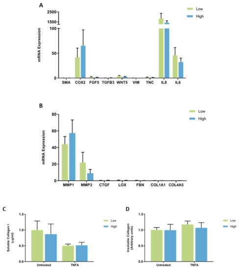 When the results were separated according to the MD score of each patient sample, no differences in the expression of CAF-related genes were observed between fibroblasts from breast tissue with high or low MD when treated with TNFA (Figure 11A). There were no differences in the expression of genes involved in ECM regulation between fibroblasts from high or low MD patient samples when treated with TNFA (Figure 11B). There was no difference in collagen I production or insoluble collagen production between fibroblasts from breast tissue with high or low MD when treated with TNFA (Figure 11C,D).