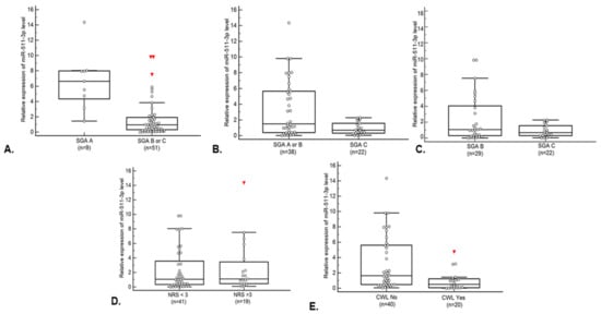 Relative expression of miR-511-3p level in group of patients: (A) well -nourished vs. moderately or severely malnourished (according to SGA); (B) well- nourished or moderately malnourished vs. severely malnourished (according to SGA); (C) moderately malnourished vs. severely malnourished (according to SGA); (D) with results <3 vs. ≥3 in scale of malnutrition risk (according to NRS-2002); (E) with vs. without critical weight loss. Abbreviations: CWL—critical weight loss, NRS-2002—Nutritional Risk Screening 2002, and SGA—subjective global assessment.