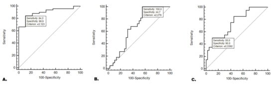 The assessment of the relative expression of miR-511-3p in predicting the occurrence of nutritional deficiencies was conducted using ROC analysis with AUC calculation. (A) Moderate or severe malnutrition (according to SGA); (B) severe malnutrition (according to SGA); (C) critical weight loss. Abbreviations: AUC—area under the curve, CWL—critical weight loss, SGA—subjective global assessment, and ROC—receiver operating characteristic.