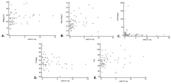 Correlation between the relative expression of miR-511-3p and nutritional status indicators: correlation between the relative expression of miR-511-3p and (A) BMI (kg/m2); (B) the level of albumin (g/L); (C) CRP [mg/L]; (D) FFM (kg); (E) the NRI. Detailed data are presented in Table 3. Abbreviations: BMI—body mass index, CRP—C-reactive protein, FFM—fat-free mass, and NRI—nutrition risk index.