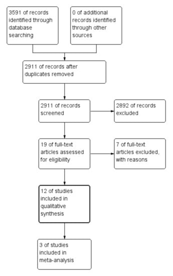 After the literature search, 2911 relevant non-duplicated records were identified; 2892 of them were excluded based on the title or the abstract because they covered a variety of irrelevant topics. Finally, 12 studies, published between 2012 and 2021, matched the selection criteria and were included in the quality analysis, as shown in Figure 1 [14,18,19,20,21,22,23,24,25,26,27,28]. The authors of potentially eligible studies with minor missing or incomplete data were directly contacted and invited to contribute additional information and data.