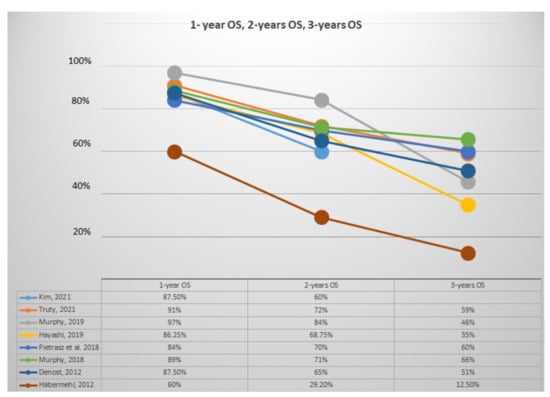 Articles with FOLFORINOX as the main regimen had a 1-year OS varying from 84% to 97%, 2-year OS from 70% to 84%, and 3-year OS from 46% to 66% [14,21,22]. Articles with Gemcitabine as the main regimen used had a 1-year OS varying from 60% to 87%, 2-year OS from 29% to 68.75%, and 3-year OS from 12.5% to 51% [20,27,28].