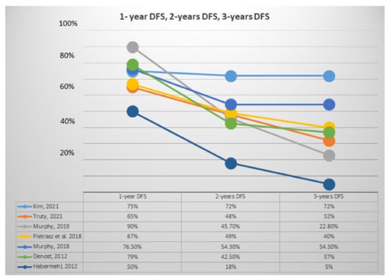 Figure 3 summarized values of 1-, 2-, and 3-year DFS. The 1-, 2-, and 3-year DFS varied from 50% to 90%, 18% to 72%, and 5% to 72%, respectively. Articles with patients with a diagnosis of LA PDAC had 1-year DFS varying from 50% to 90%, 2-year DFS from 18% to 45.7%, and 3-year DFS from 5% to 37% [21,27,28].