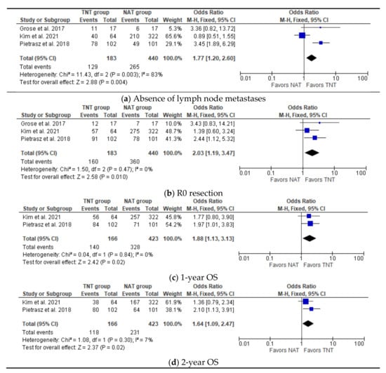 All three studies investigating patients with PDAC undergoing TNT followed by surgery in comparison with patients undergoing surgery after NAT assessed an intervention group versus a control group. A total of 623 patients have been evaluated, of which 183 underwent intention-to-treat surgery after TNT and 440 underwent intention-to-treat surgery after NAT. As shown in Figure 4, three studies reported data on lymph node metastases and radicality, with a significant benefit for TNT groups (OR 1.77, 95% CI 1.2–2.60, p = 0.004 and OR 2.03, 95% CI 1.19–2.60, p = 0.01, respectively) [14,18,24]. Furthermore, two studies reported data of 1-year OS and 2-year OS with a significant benefit in favor of the TNT group (OR 1.88, CI 1.13–3.13, p = 0.02 and OR 1.64, CI 1.09–2.47, p = 0.02) [14,18].