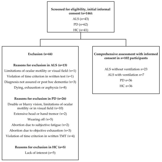 The purpose of our present study was to evaluate the usability and sensitivity of this electronic eye-tracking-based “motor-free” TMT-version (eTMT), which can be adapted to patients with different extents of motor impairment by using a fixed or a mobile and adjustable ETCS. Therefore, we examined patients with the two paradigmatic “motor” neurodegenerative diseases PD and ALS in early to advanced disease stages, also taking oculomotor functioning into account.