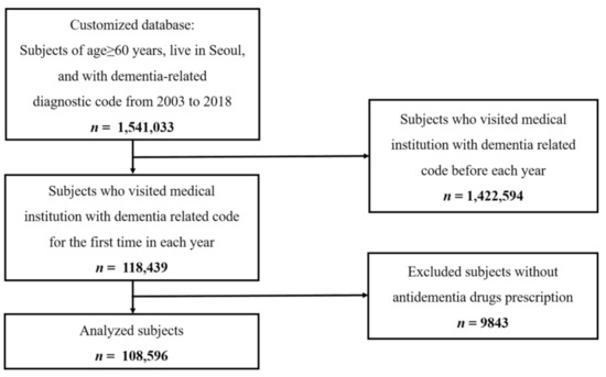 This study was conducted using anonymous customized research data extracted from the NHIS Database between 1 January 2002 and 31 December 2018. This database is based primarily on the Korean NHIS, a single government insurer that covers about 97% of the Korean population. Korean hospitals and nursing facilities are supported by the NHIS. The customized database is representative of the transmission data provided by anonymous health insurance and long-term care insurance data [9]. The database provides healthcare utilization information for both inpatients and outpatients and includes patient demographics, diagnosis, comorbidities, and prescribed medication. The Korean Classification of Disease (KCD), 5th to 7th editions, and modification of the International Classification of Disease and Related Health Problems, 10th revision were used to code diagnoses. Data on demographics (including age, sex, and income), accompanying diagnostic codes including diabetes (E10~14), chronic obstructive pulmonary disease (J44), chronic kidney disease (N18), dyslipidemia (E78), stroke (I60~64), hypertension (I10~15), and depression (F32, F33, F34.1) were collected using the NHIS coding system. The type of antidementia drug (donepezil, galantamine, rivastigmine, or memantine) was collected, and pharmaceutical prescription codes for antidementia drugs are described in Table S1 (Supplementary Materials).