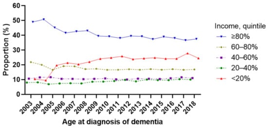 The overall demographics, comorbidities, and prescribed medications of the incident cases are described in Table 1. The number of incident cases increased with age and was higher in females. Among the incident dementia cases, 19.7% had hypertension, 8.0% had diabetes, 9.1% had dyslipidemia, and 15.0% had depression-related diagnostic codes. Donepezil (74.9%) was the most prescribed drug at dementia diagnosis, followed by rivastigmine (9.7%), memantine (9.0%), and galantamine (6.4%). Demographics, comorbidities, and prescribed medications of the incident cases in each year are described in Table 2 (from 2003 to 2010) and Table 3 (from 2011 to 2018). Among comorbidities, the percentage of dementia cases with hypertension decreased gradually since 2006, while those with dyslipidemia increased steadily since 2003. The proportion of incident dementia cases was highest in the highest income group (≥80%) every year. However, the proportion of incident dementia cases in the lowest income group (<20%) increased from 10.4% in 2003 to 25.8% in 2011 and has remained at that level (Figure 2).