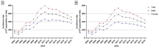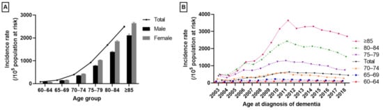The incidence rates of dementia in the whole group increased with age (Figure 4A,B) from 82.01 per 105 population at risk (95% CI: 80.05–83.98) at the age of 60–64 years to 2496.09 (95% CI: 2464.93–5527.25) at age ≥85 years. The incidence rate was slightly higher in males aged 60–64 years; in the other age groups, it was higher in females (Figure 4A). The annual incidence rates of dementia patients stratified by age group are shown in Figure 4B.