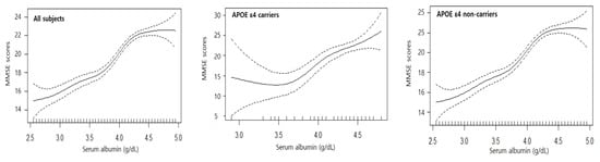 The GAM regression was used to explore nonlinear associations between serum albumin and cognitive function. The estimated smooth effect curves demonstrating the associations between the median serum albumin levels and the median MMSE scores are shown in Figure 1. In all cases (all subjects, APOE ε4 carriers, and APOE ε4 non-carriers), as serum albumin increased, the MMSE scores increased. All associations were statistically significant at the α = 0.05 level.
