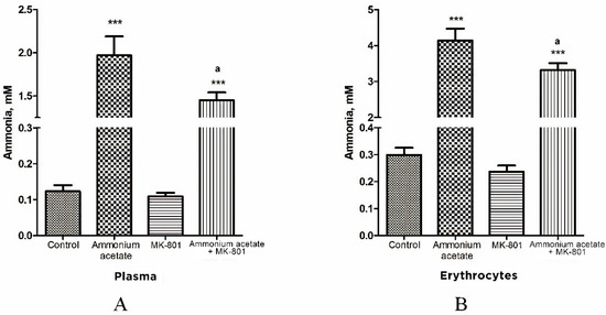 We showed earlier that MK-801, a potent non-competitive NMDAR antagonist, reduces excessive amounts of brain ammonia in hyperammonemic rats [19]. We then examined whether MK-801 could affect ammonia levels in NMDAR-equipped circulating erythrocytes [63,64] in rats with hyperammonemia. Plasma ammonia levels in all of the studied groups of animals were simultaneously determined (Figure 1).