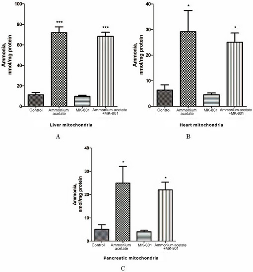 As increased ammonia is the main mediator in brain mitochondria dysfunction triggered by activation of NMDA receptor signaling pathways [18], we tested the ammonia content in mitochondria isolated from the liver, heart, and pancreas of hyperammonemic rats and examined whether MK-801 could prevent the increase in ammonia level in these organelles.