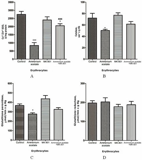 Activities of antioxidant enzymes superoxide dismutase (A), catalase (B), glutathione peroxidase (C), and glutathione reductase (D) in erythrocytes of animals in different experimental groups. Experimental design was the same as in Figure 1 legend. Erythrocyte enzyme activity was measured as indicated in Materials and Methods. The results are presented as mean ± SEM. Values significantly different from control are designated with one (*) and three (***) asterisks: * p < 0.05, *** p < 0.001 (Student’s t-test). a significant differences, compared with the ammonia group. aaa p < 0.001 (with the Bonferroni correction for multiple comparisons).