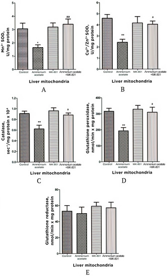 Activities of antioxidant enzymes superoxide dismutase (Mn2+ (A) and Cu2+, Zn2+ (B) isoforms), catalase (C), glutathione peroxidase (D), and glutathione reductase (E) in liver mitochondria of animals in different experimental groups. Experimental design was the same as in Figure 1 legend. The enzyme activity was measured as indicated in Materials and Methods. All data are shown as mean ± SEM. Values significantly different from the control group are designated with one (*) and two (**) asterisks: * p < 0.05, ** p < 0.01 (Student’s t-test). a significant differences when compared with ammonia group. a p < 0.05, aa p < 0.01 (with the Bonferroni correction for multiple comparisons).