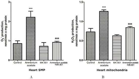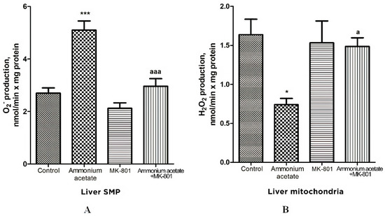 Effects of injection of ammonium acetate and/or MK-801 on O2•− (A) and H2O2 (B) production by liver SMP and mitochondria. Experimental design was the same as in Figure 1 legend. The rates of O2• − and H2O2 formation were determined as indicated in Materials and Methods. All data are shown as mean ± SEM. Values significantly different from the control group are designated with one (*) and three (***) asterisks: * p < 0.05, *** p < 0.001 (Student’s t-test). a significant differences, compared with ammonia group. a p < 0.05, aaa p < 0.001 (with the Bonferroni correction for multiple comparisons).