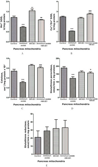 The aim of this study was to evaluate the effects of NMDAR blockade with MK-801 on the imbalance between oxidant and antioxidant systems leading to oxidative stress, focusing on superoxide radical and hydrogen peroxide production by mitochondria isolated from NMDAR-equipped non-neuronal tissues including the pancreas, heart, and liver of hyperammonemic rats. Antioxidant enzyme activities of glutathione peroxidase, glutathione reductase, catalase, and superoxide dismutase in mitochondria from tissue and in erythrocytes were also measured.