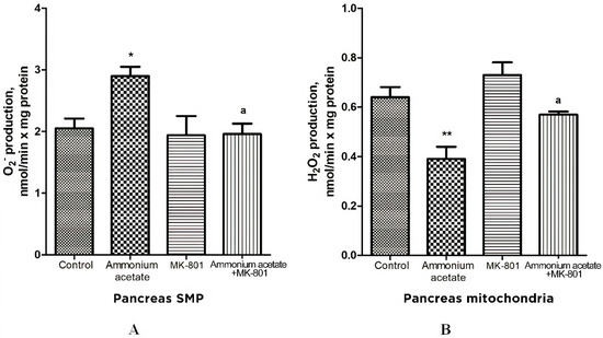The effect of ammonium acetate and MK-801 injection on the rate of O2•− (A) and H2O2 (B) formation in rat pancreas SMP and mitochondria. Experimental design was the same as in Figure 1 legend. The rates of O2•− and H2O2 formation were determined as indicated in Materials and Methods. The results are represented as mean ± SEM. Values significantly different from the control group are designated with one (*) and two (**) asterisks: * p < 0.05, ** p < 0.01, (Student’s t-test). a significant differences, compared with ammonia group. a p < 0.05 (with the Bonferroni correction for multiple comparisons).
