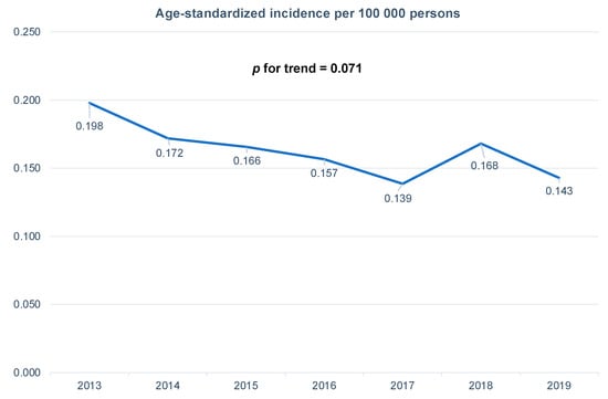 Age-standardized incidences of traumatic out-of-hospital cardiac arrests following traffic collisions from 2013–2019.