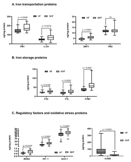 The concentration of iron metabolism proteins in the non-failing human myocardium. (A)—Iron transportation proteins, (B)—Iron storage proteins, (C)—Regulatory factors and oxidative stress proteins. Only significant differences are shown; all results are presented in the supplement (Table S3); p—level of significance. Aberrations: HF (failing hearts), NHF (non-failing hearts), DMT-1 (divalent metal transporter -1), L-CH (L-type calcium channel Subunit CACNa1D), TfR-1 or -2 (transferrin receptor -1 or -2), FT-H (ferritin heavy chain), FT-L (ferritin light chain), FT-MT (ferritin- mitochondrial), FPN (ferroportin), Hepc (hepcidin), ACO-1 (aconitase- 1), IREB-2 (iron response protein-2), HIF-1 (hypoxia-induced factor), HJV (hemojuvelin), 4-HNE (4-hydroxynonenal).