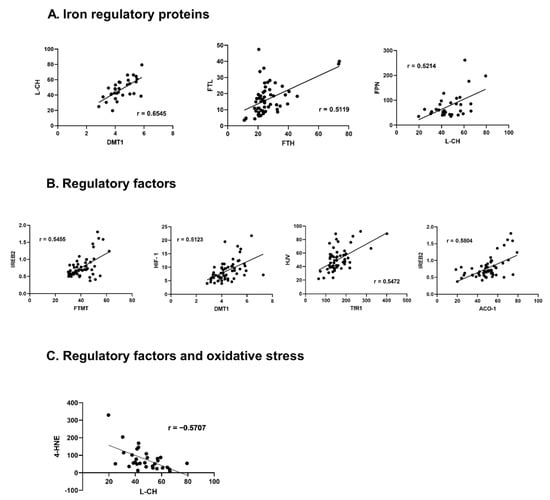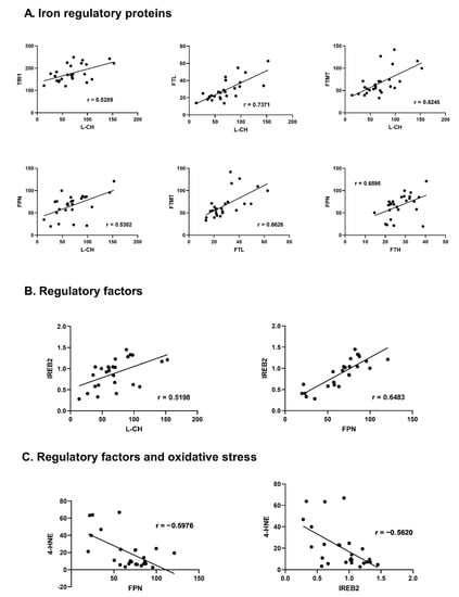 HNE-4 presented significant negative correlations with: proteins responsible for iron transportation into the cell: DMT-1 (r = −0.3773, p = 0.036), L-CH (r = −0.5707, p = 0.001); storage protein FT-H (r = −0.3790, p = 0.036) and removal protein FPN (r = −0.4219, p = 0.018). HNE-4 correlated negatively with ACO-1 (r = −0.4478, p = 0.012). (Figure 3, Table S7).