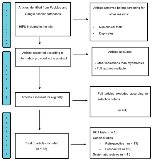 - Anneveldt, K.J.; van ’t Oever, H.J.; Nijholt, I.M.; Dijkstra, J.R.; Hehenkamp, W.J.; Veersema, S.; Huirne, J.A.F.; Schutte, J.M.; Boomsma, M.F. Systematic review of reproductive outcomes after high intensity focused ultrasound treatment of uterine fibroids. Eur. J. Radiol. 2021, 141, 109801. [Google Scholar] [CrossRef]