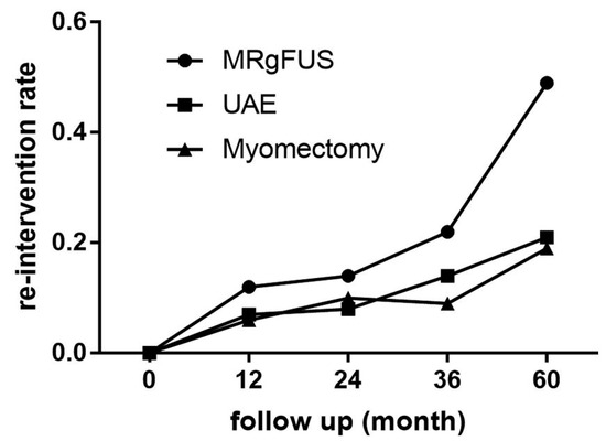 - Li, W.; Jiang, Z.; Deng, X.; Xu, D. Long term follow up outcome and reintervention analysis of ultrasound guided focused ultrasound treatment for uterine fibroids. Int. J. Hyperth. 2020, 37, 1046–1051. [Google Scholar] [CrossRef] [PubMed]