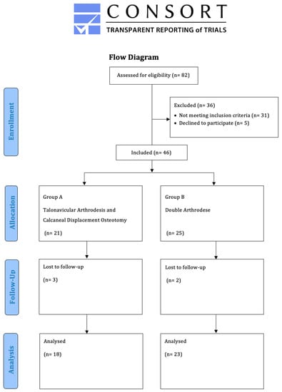 Between 2016 and 2020, 41 patients (13 males (31.7%), 28 females (68.3%); mean age of 63 years (range: 35–81 years)) were retrospectively enrolled in this comparative study. The demographics of both groups were comparable (Table 1). The radiological angles were also comparable (Table 2). All patients were seen in the foot surgery consultation clinic of the study center (Figure 1). The AAFD diagnoses were always made on the basis of clinical examination, obligatory weight-bearing radiographs, and, where necessary, additional MRI scans. All patients underwent isolated bony realignment of the deformity: group A (n = 19) underwent calcaneal displacement osteotomy and talonavicular arthrodesis, and group B (n = 23) underwent double arthrodesis.