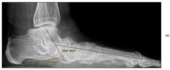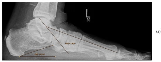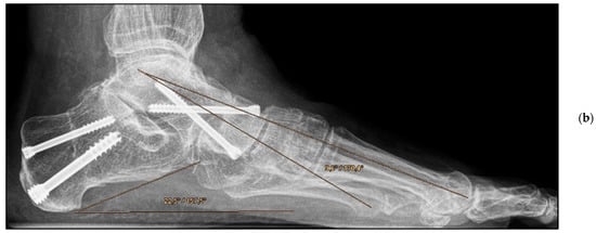 The Foot Function Index-D (FFI-D) with 18 items (10 items for disability, 8 items for pain) and the SF-12 questionnaire, with the physical and mental component summaries, were collected by the treating surgeon in order to assess clinical outcomes. Demographic data including BMI, pre-existing conditions such as diabetes mellitus and arterial hypertension (metabolic syndrome-associated), and nicotine abuse were obtained for each patient. In addition, a comparison of the pre-operative and post-operative radiographs was performed. Of particular interest were the dorsoplantar (dp) talocalcaneal angle, dp talo–first metatarsal angle, talonavicular coverage angle, lateral talocalcaneal angle, and talus–first metatarsal angle on the lateral view. Radiographic measurements were taken independently by a radiologist and treating surgeon.